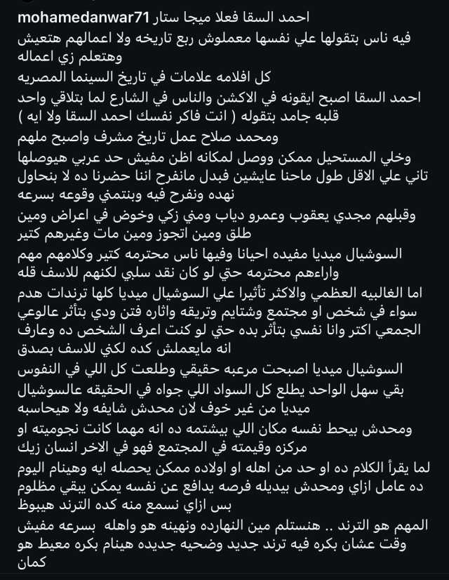 وأردف: "السوشيال ميديا مفيده احيانا وفيها ناس محترمه كتير وكلامهم مهم واراءهم محترمه حتي لو كان نقد سلبي لكنهم للاسف قله اما الغالبيه العظمي والاكثر تأثيرا علي السوشيال ميديا كلها ترندات هدم سواء في شخص او مجتمع وشتايم وتريقه واثاره فتن ودي بتأثر عالوعي الجمعي اكتر وانا نفسي بتأثر بده حتي لو كنت اعرف الشخص ده وعارف
