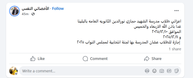 يستمر غدا الخميس 11 ديسمبر 2025 ، تطبيق قرار تعليق الدراسة في المدارس المنعقد بها لجان انتخابية في انتخابات مجلس النواب 2025