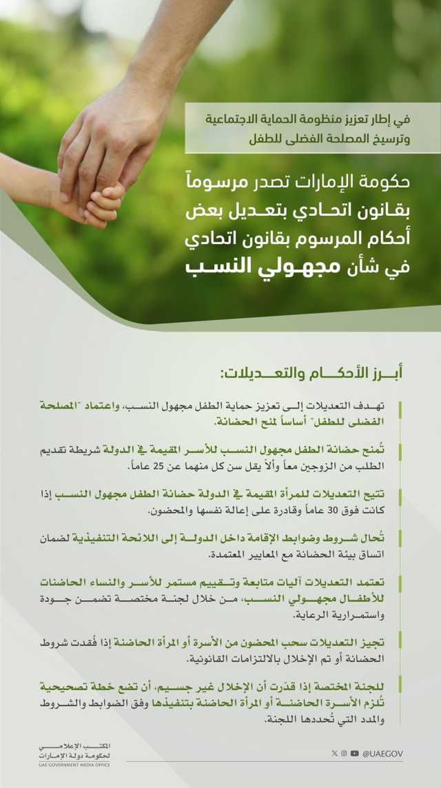 وتؤكد هذه التعديلات حرص دولة الإمارات على تطوير منظومة حماية الطفل بما يعكس قيمها الاجتماعية والإنسانية، ويُعزز مبادئ العدالة والرحمة والتمكين الأسري، ويُترجم التزام الدولة بتمكين الأطفال مجهولي النسب من حياة كريمة تكفل لهم الاندماج الإيجابي في المجتمع، وتُوفر لهم فرصاً متكافئة للنمو والتعلم ضمن بيئة أسرية آمنة ومستقرة تراعي احتياجاتهم النفسية والاجتماعية والتعليمية.