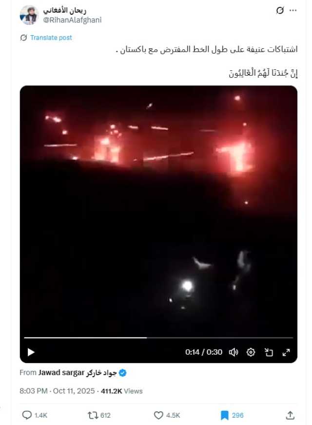 وحصد الفيديو مئات الآلاف من المشاهدات عبر منصة إكس وحدها، مصحوبًا بوصف يقول: "اشتباكات عنيفة على طول الخط المفترض مع باكستان".