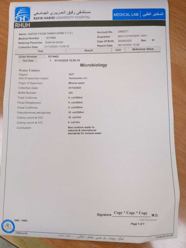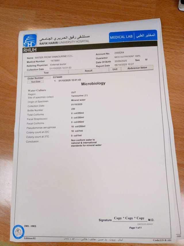 اطلع "لبنان24" على نتائج الفحوصات المخبرية التي أجرتها وزارة الصحة العامة لعينات مأخوذة من مياه "تنورين"، والتي أظهرت وجود تلوث فيها. وكانت الوزارة أصدرت قراراً منع الشركة من تعبئة المياه وسحب منتجاتها من السوق.بدورها، علقت شركة "تنورين" على القرار، معلنة عن "عقد مؤتمر صحافي في مقر الشركة - جسر الباشا وذلك يوم الثلاثاء الواقع في 14 تشرين الأول الجاري، عند الساعة الثانية عشرة ظهراً".