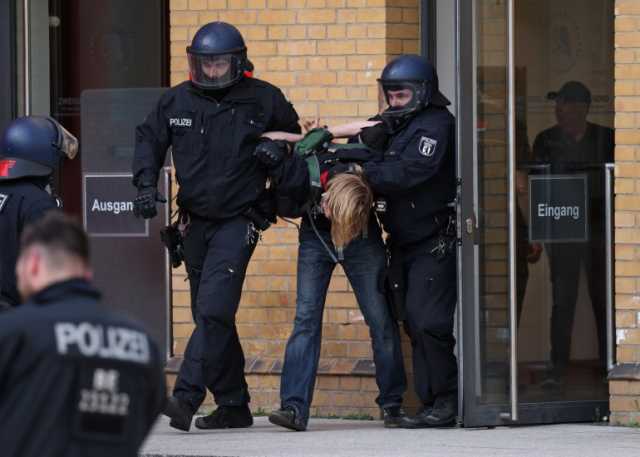 وظهر المدان بصحبة ضباط شرطة، حيث ربت على كتف شخص ما وهو يضحك، قبل أن يلجأ ضابط آخر لتكبيل يديه.