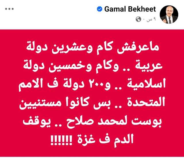 وكتب جمال بخيت عبر صفحته على موقع التواصل الاجتماعي فيسبوك:" ماعرفش كام وعشرين دولة عربية .. وكام وخمسين دولة إسلامية .. و200 دولة فى الأمم المتحدة .. بس كانوا مستنيين بوست لمحمد صلاح .. يوقف الدم في غزة !".
