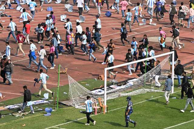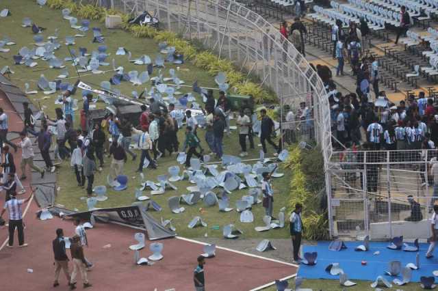 وأظهر مقطع فيديو لوكالة «إيه إن آي» للأنباء قيام المشجعين برمي مقاعد ومقذوفات أخرى على أرض الملعب ومضمار ألعاب القوى، فيما تسلق بعضهم السياج المحيط بالمكان لإلقاء المقذوفات.