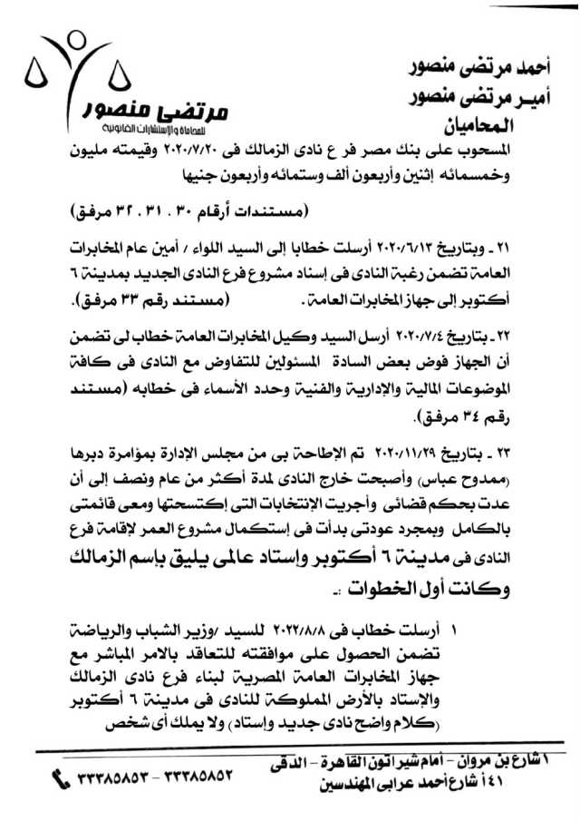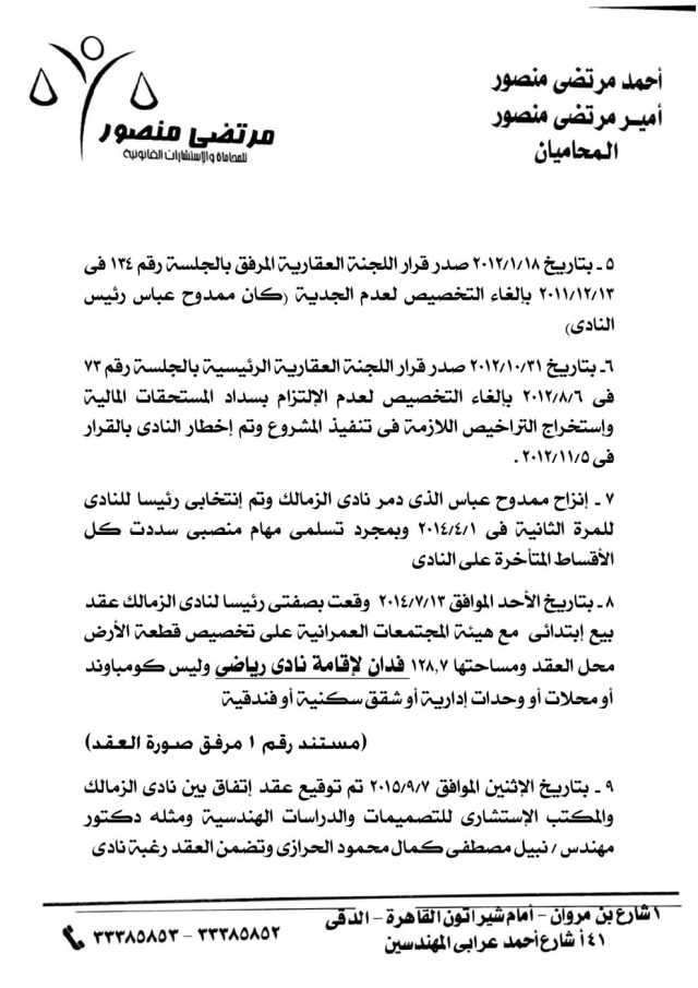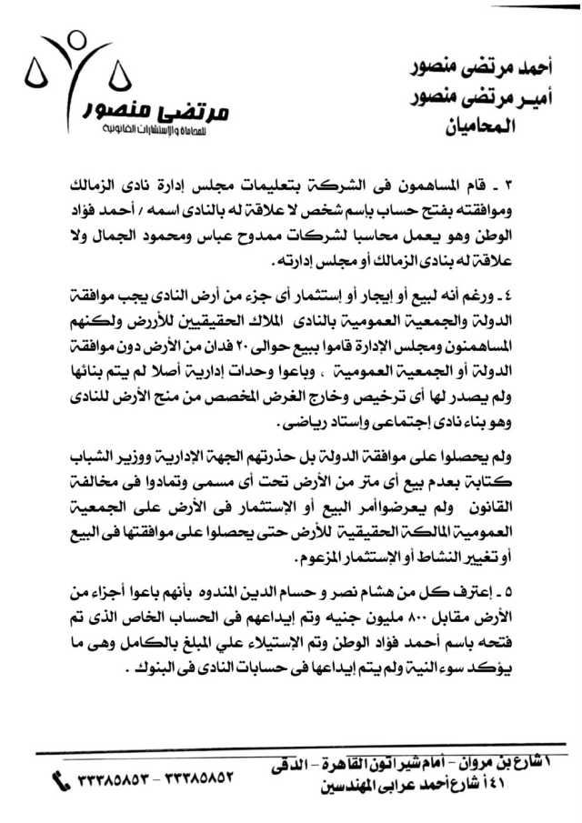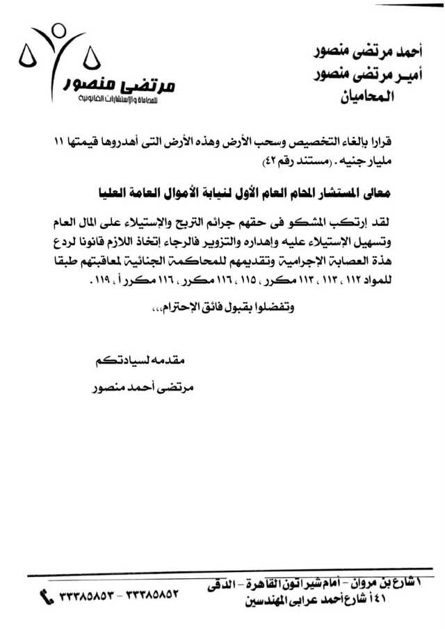 يتقدم مرتضى منصور المحامي بالنقض والادارية العليا ببلاغ رسمي موجها الى المحامي العام الاول لنيابة الاموال العامة العليا ضد مجموعة من الاسماء الواردة بالنص الاصلي وعلى رأسهم حسين احمد لبيب وهشام نصر سليمان وحسام الدين المندوه توفيق واحمد سليمان عفيفي وهاني نبيه برزي وهاني شكري نجيب وعمرو علي ادهم وحسين سيد عبد الحميد ونيرة مصطفى نصر ومحمد طارق حسن واحمد خالد سعيد ورامي ابراهيم نصوحي اضافة الى طارق يوسف رئيس مجلس ادارة إحدي الشركات ومحمود الجمال رجل اعمال وعمرو يوسف الجنايني الرئيس التنفيذي لأحد البنوك الخاصة وحسن موسى مدير عام نادي الزمالك ومحمد الاتربي رئيس لأثنين من البنوك المملوكة للدولة الكبري واحمد فؤاد الوطن المسؤول عن إحدي الشركات الخاصة.