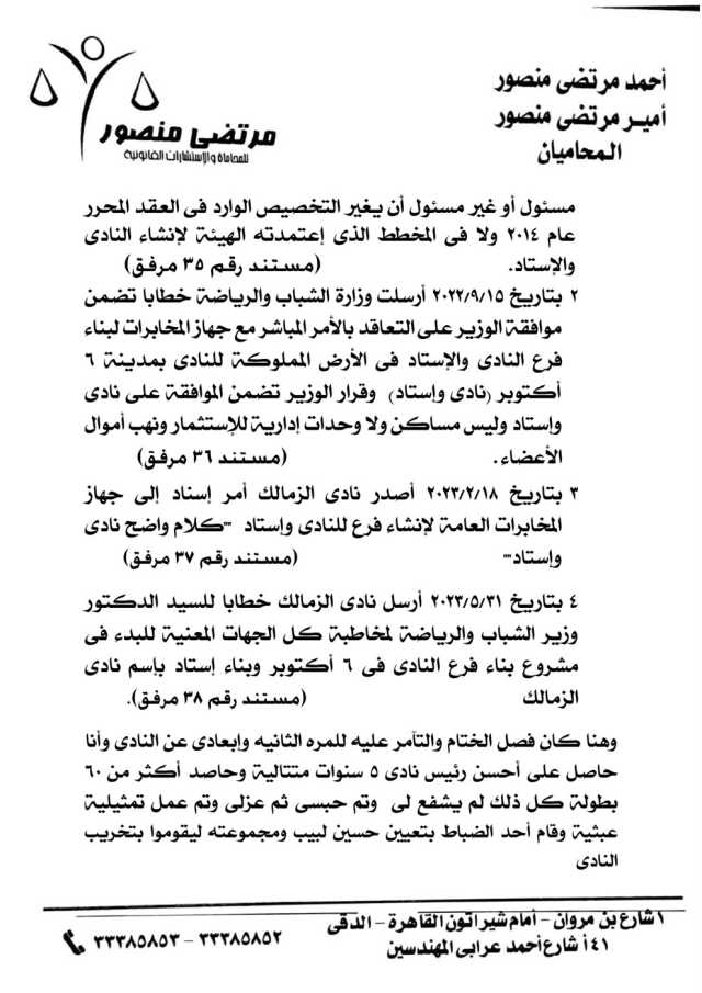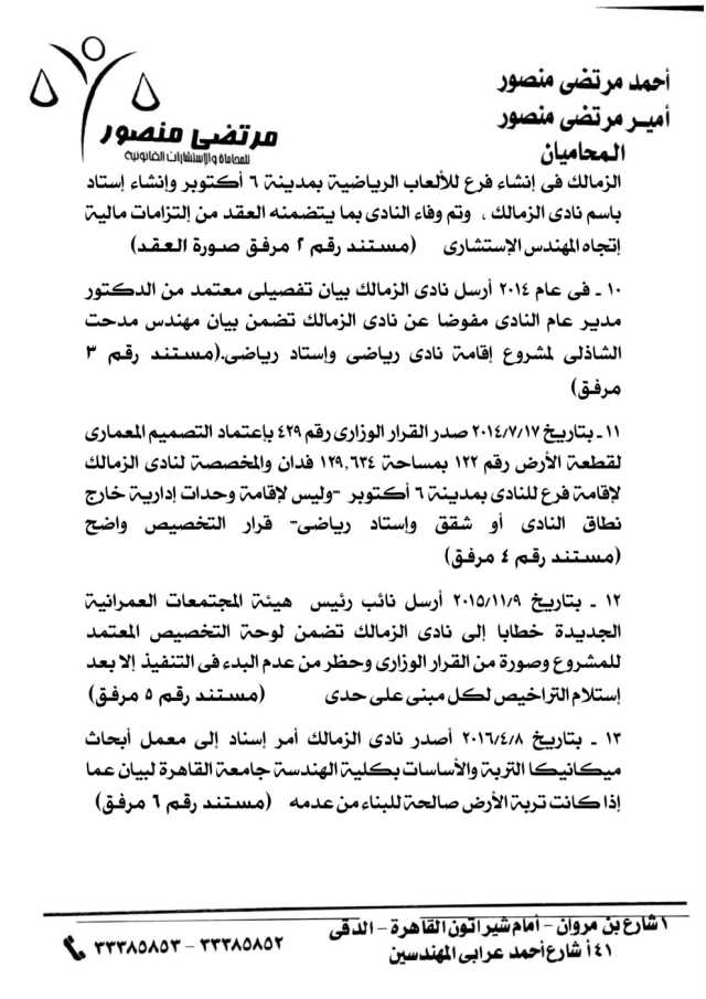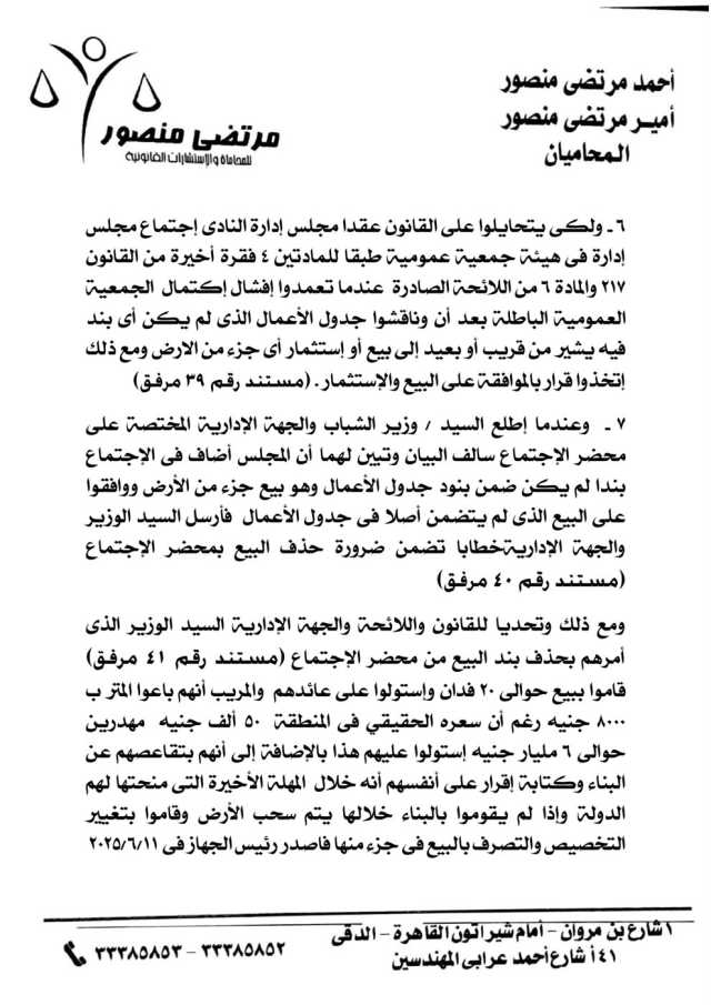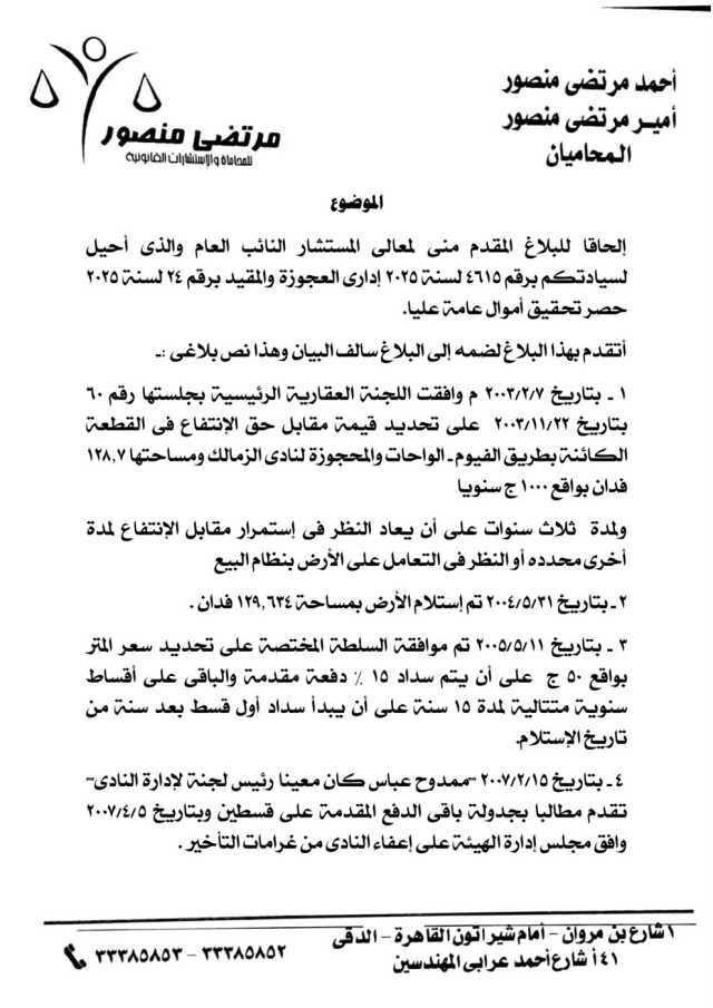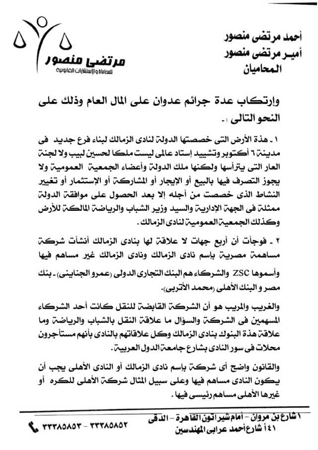 بلاغ جديد يكشف اتهامات خطيرة في ملف ارض نادي الزمالكيفتح البلاغ المقدم من مرتضى منصور ملفا شائكا يتعلق بأرض نادي الزمالك في مدينة 6 اكتوبر حيث يعرض سلسلة وقائع وقرارات سابقة تمس كيفية التصرف في الارض منذ تخصيصها وحتى الاتهامات الاخيرة ببيع اجزاء منها من دون موافقة الجهات المختصة وهو ما يعيد ابراز خطورة القضية على المال العام وعلى حقوق اعضاء الجمعية العمومية.