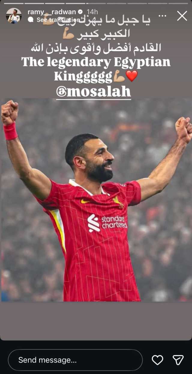 ونشر رضوان صورة لصلاح عبر ستورى انستجرام، وكتب: "يا جبل ما يهزك ريح الكبير كبير، القادم أفضل وأقوى بإذن الله".