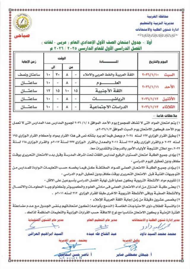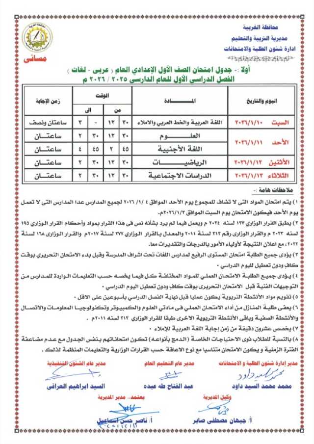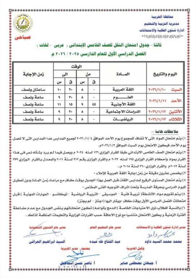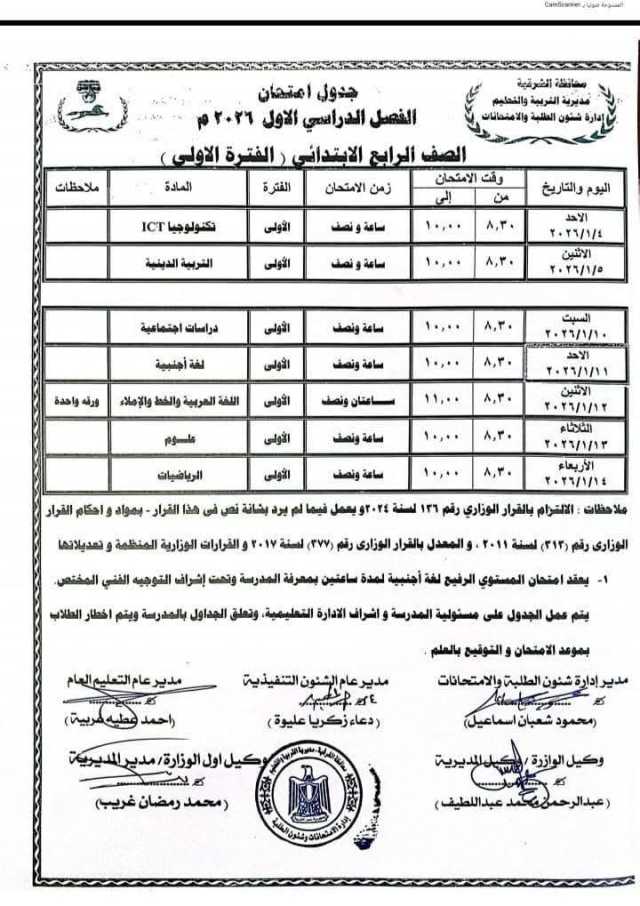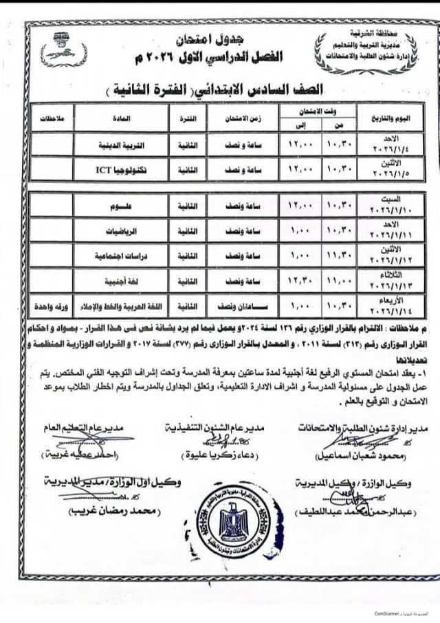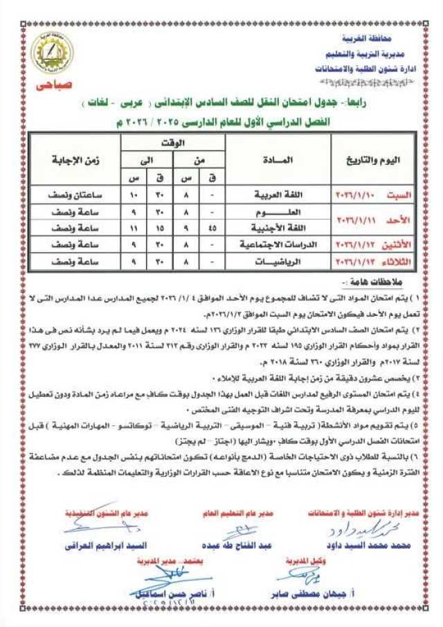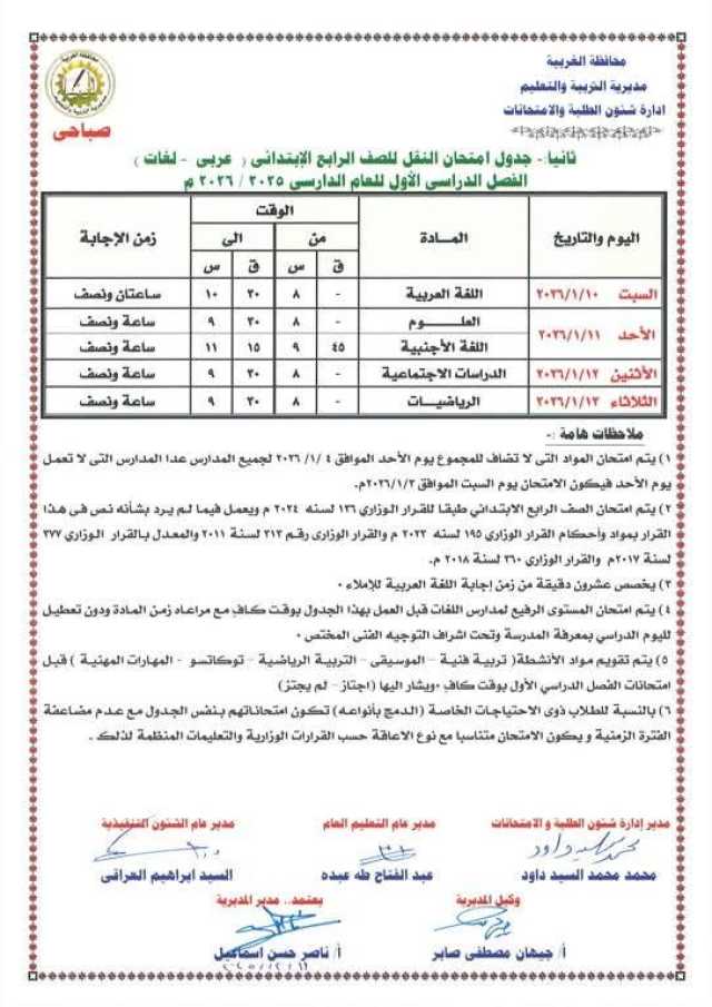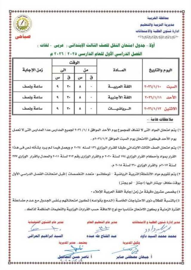 من جانبها بدأت مديريات التربية والتعليم وأبرزها مديريتي الشرقية والغربية ، في إعلان جدول امتحانات نصف العام 2026 جميع الصفوف