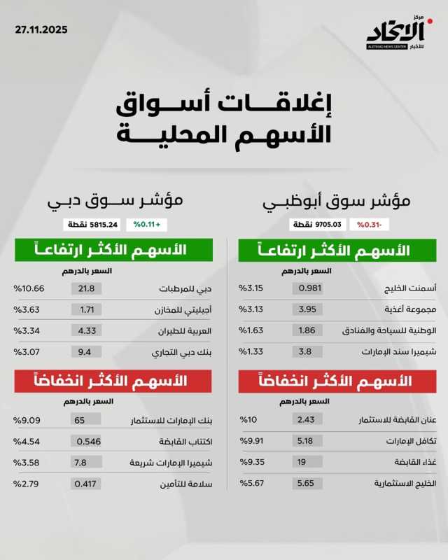 وبلغت قيمة التداول الإجمالية في ختام التعاملات 444.66 مليون درهم، بعد التعامل على 285.81 مليون سهم، من خلال تنفيذ 12163 صفقة. وتضمّنت قائمة الأسهم النشطة المرتفعة كلاً من «طلبات» بنسبة 1.01% إلى 0.894 درهم، و«أليك القابضة» بنسبة 2.83% إلى 1.45 درهم، و«العربية للطيران» بنسبة 3.34% إلى 4.33 درهم. وفي المقابل، انخفضت أسهم نشطة مثل «الإمارات دبي الوطني» بنسبة 0.6% إلى 24.55 درهم، و«شعاع كابيتال» بنسبة 1.64% ليغلق السهم عند 0.239 درهم، وأيضاً انخفض «الإثمار القابضة» بنسبة 1.85% إلى 0.265 درهم، فيما انخفض سهم «بنك دبي الإسلامي» بنسبة 0.21% إلى 9.18 درهم، وانخفض «إعمار العقارية» بنسبة 0.37% إلى 13.2 درهم، و«اكتتاب» بنسبة 4.54% إلى 0.546 درهم، وأيضاً «دريك آند سكل» بنسبة 1.58% ليغلق عند 0.31 درهم.